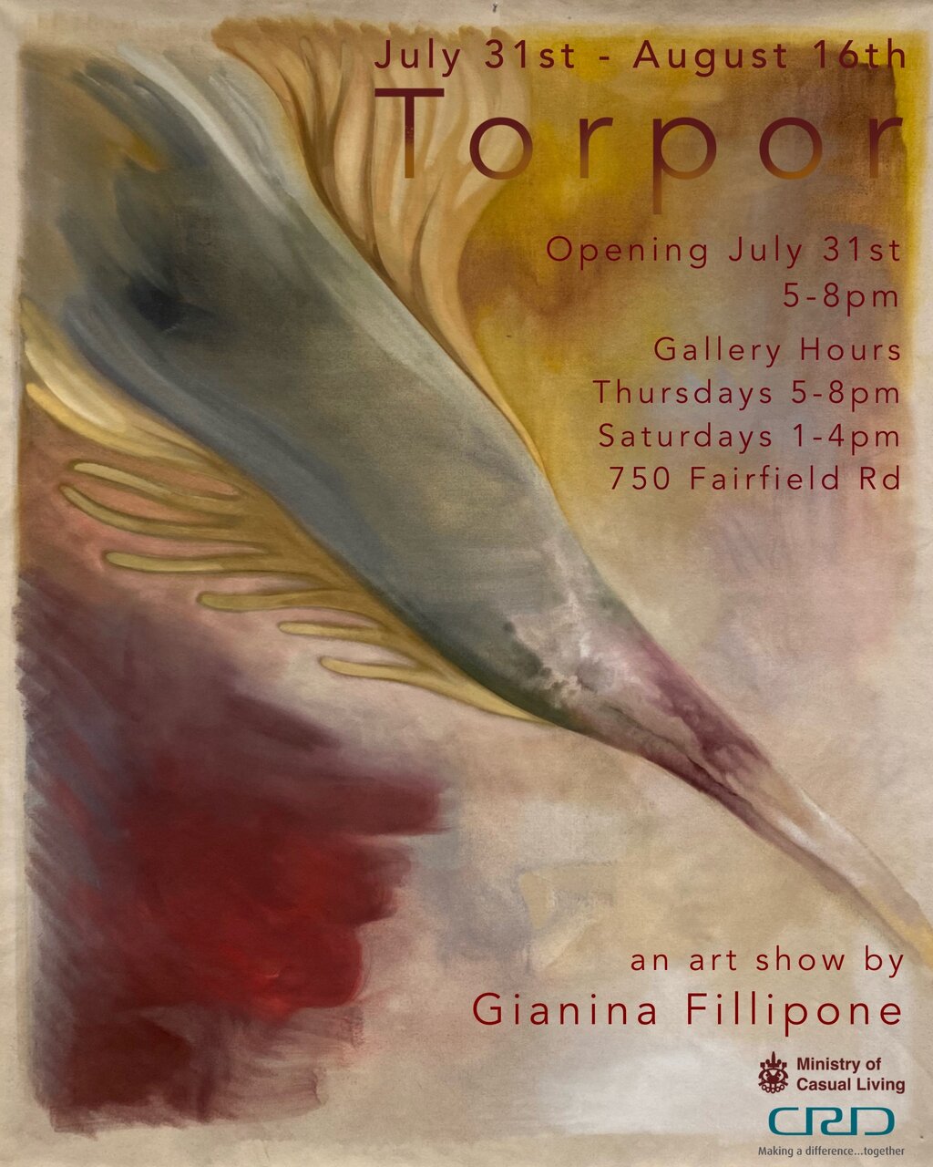 Join us for "Torpor", a solo exhibition by Gianina Fillipone. "Torpor" will be opening this Thursday, July 31st, 5-8pm at the Ministry of Casual Living, 750 Fairfield Rd.