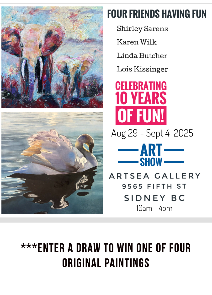 It’s hard to believe! It is the 10th Year that Karen Wilk, Shirley Sarens, Linda Butcher and Lois Kissinger are setting up their art studios at the Art Sea Gallery, spending the week having fun painting together, exhibiting their original artwork and art cards, welcoming guests and filling the gallery with chatter and laughter. Stop in to see what they are working on, enjoy celebration fun and prizes, and enter a free draw for one of 4 original paintings.