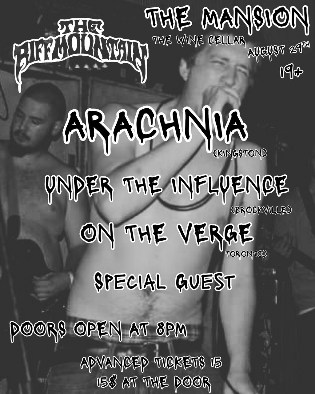August 29th in the wine cellar at the mansion The Riff Mountain presents Arachnia! with Under the Influence from Brockville On the verge from Toronto. come out for a night of pure punk rock and metal mayhem.