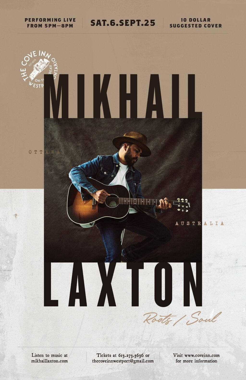 Mikhail Laxton seamlessly flows between Americana, Country, Folk Rock, Blues and more, as indefinable as Laxton himself, and ranges in topic from loss and longing, to the nostalgia for home, to moments of love. Hear this magnetic performer on the Cove patio stage on Saturday, September 6, 2025 from 5 to 8 PM.