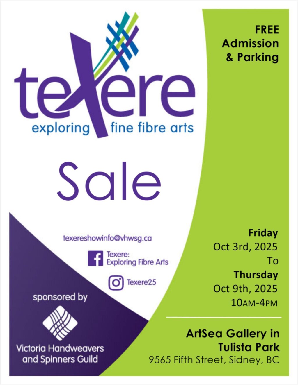 Texere is an show and sale of fibre arts, showcasing the skills of members of the Victoria Handweavers’ and Spinners’ Guild. Work includes art pieces, clothing and accessories, and household linens. There will be demonstrations of spinning, and weaving.