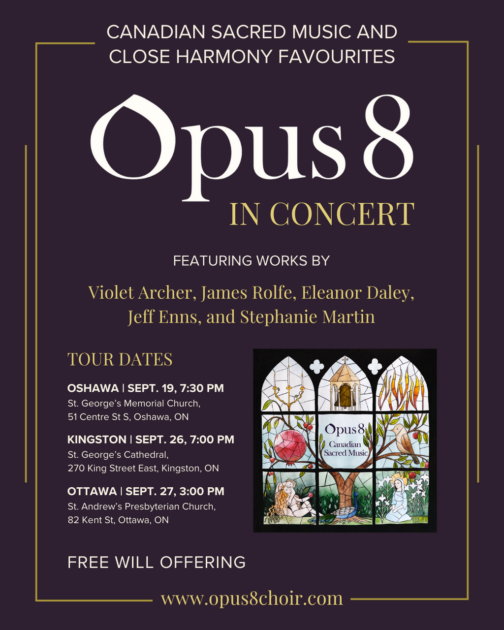 One of Toronto's finest all-professional choral groups, Opus 8, is giving a concert of Canada's finest composers at St George's Cathedral, Kingston on Friday, September 26 at 7pm. From sacred music to popular jazz classics, this concert has something for everyone, in an accessible pay-what-you-can format.
