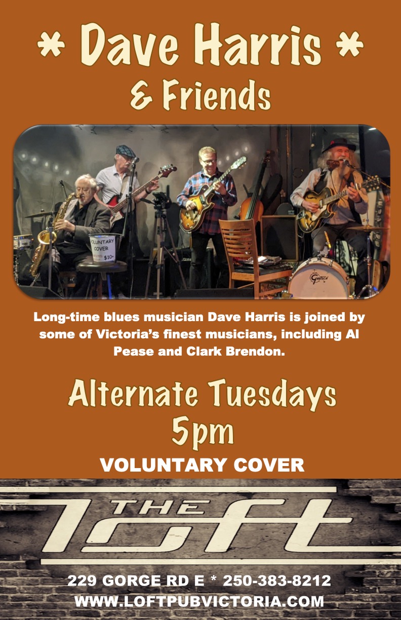 DAVE HARRIS & FRIENDS Longtime blues musician and one man band, joined by some of Victoria's finest musicians including Al Pease and Clark Brendon. 5:00PM. Voluntary Cover.