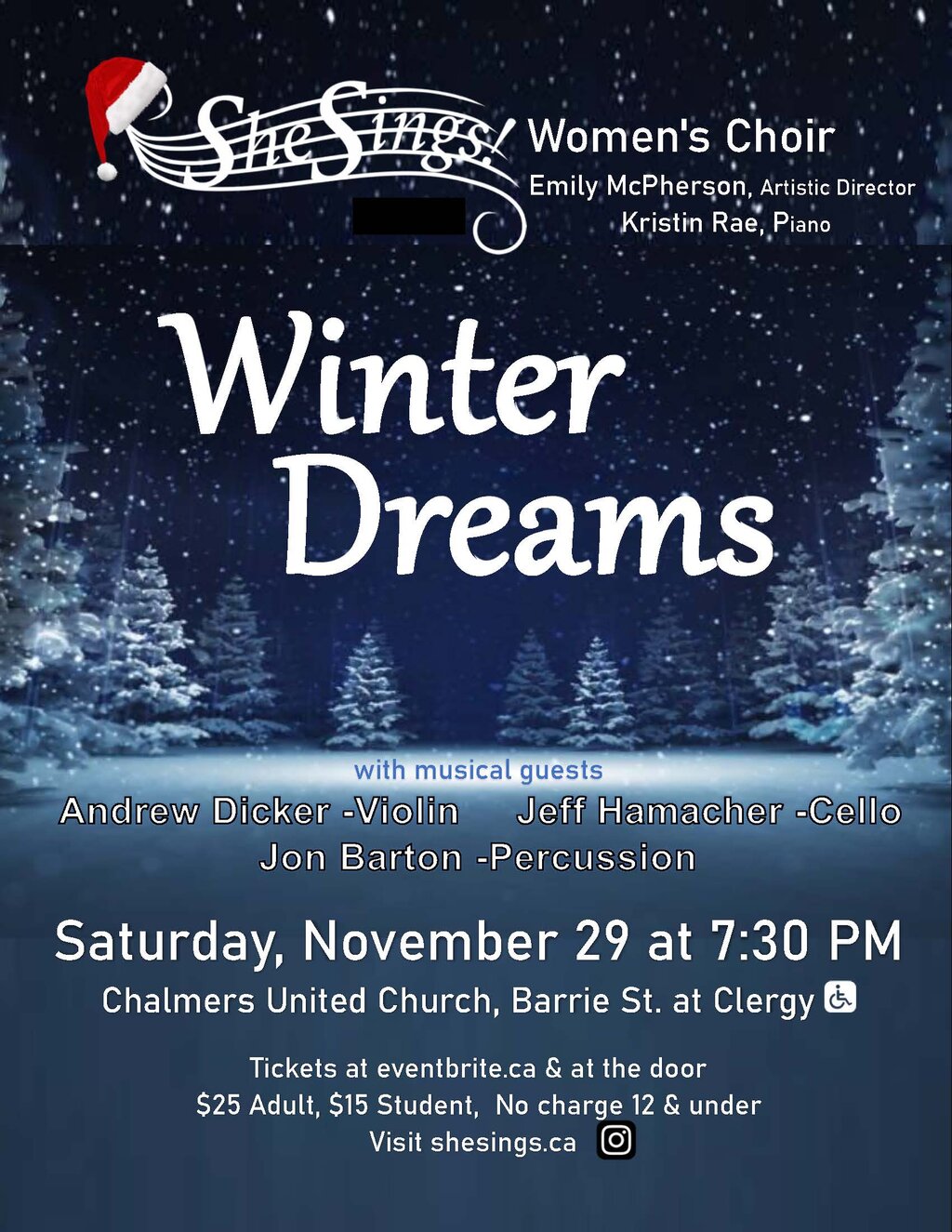 She Sings! Women's Choir presents their seasonal concert "Winter Dreams" on Saturday, November 29th at Chalmers United Church at 7:30pm. Come immerse yourself in a nostalgic, musical celebration of wintertime, featuring Kingston Symphony members Andrew Dicker on Violin, Jeff Hamacher on Cello and returning Percussionist, Jon Barton. The glorious combination of choir and strings is sure to delight and move the soul as the perfect segue into the Holiday Season! This concert will be the inaugural concert of new Artistic Director Emily McPherson, accompanied by long-time collaborative pianist, Kristin Rae. Tickets are available at the door, online at eventbrite and directly from choir members. Don't miss this magical seasonal event!