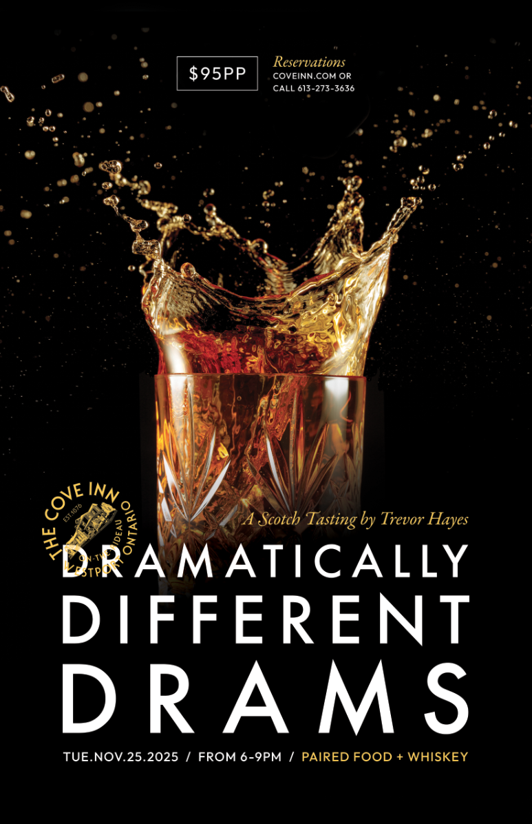 On Tuesday, November 25th, 2025 from 6-9pm, The Cove Inn will be presenting a very special event called Dramatically Different Drams: A Contemplative Scotch Tasting with Trevor Hayes. Featured will be four whiskies that are very different but each very drinkable in their own way. There will a maximum capacity of 20 attendees and the night will be a semi-casual seated event which will include scotch tasting, scotch education, inspired poetry and scotch discussion. All paired with buffet style hand held bites of food. Join us for another special night in our series with Trevor!