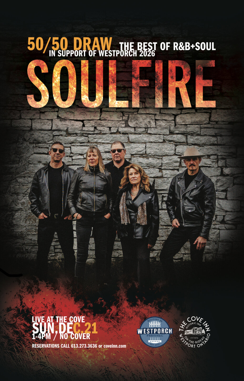 Enjoy an matinee holiday show of Pop Blues, R&B and a Touch of Funky Soul with Soulfire on Sunday, December 21, 2025. Elbows up! 1-4pm NO Cover. 50/50 draw in support of the 6th Annual Westporch Festival 2026.