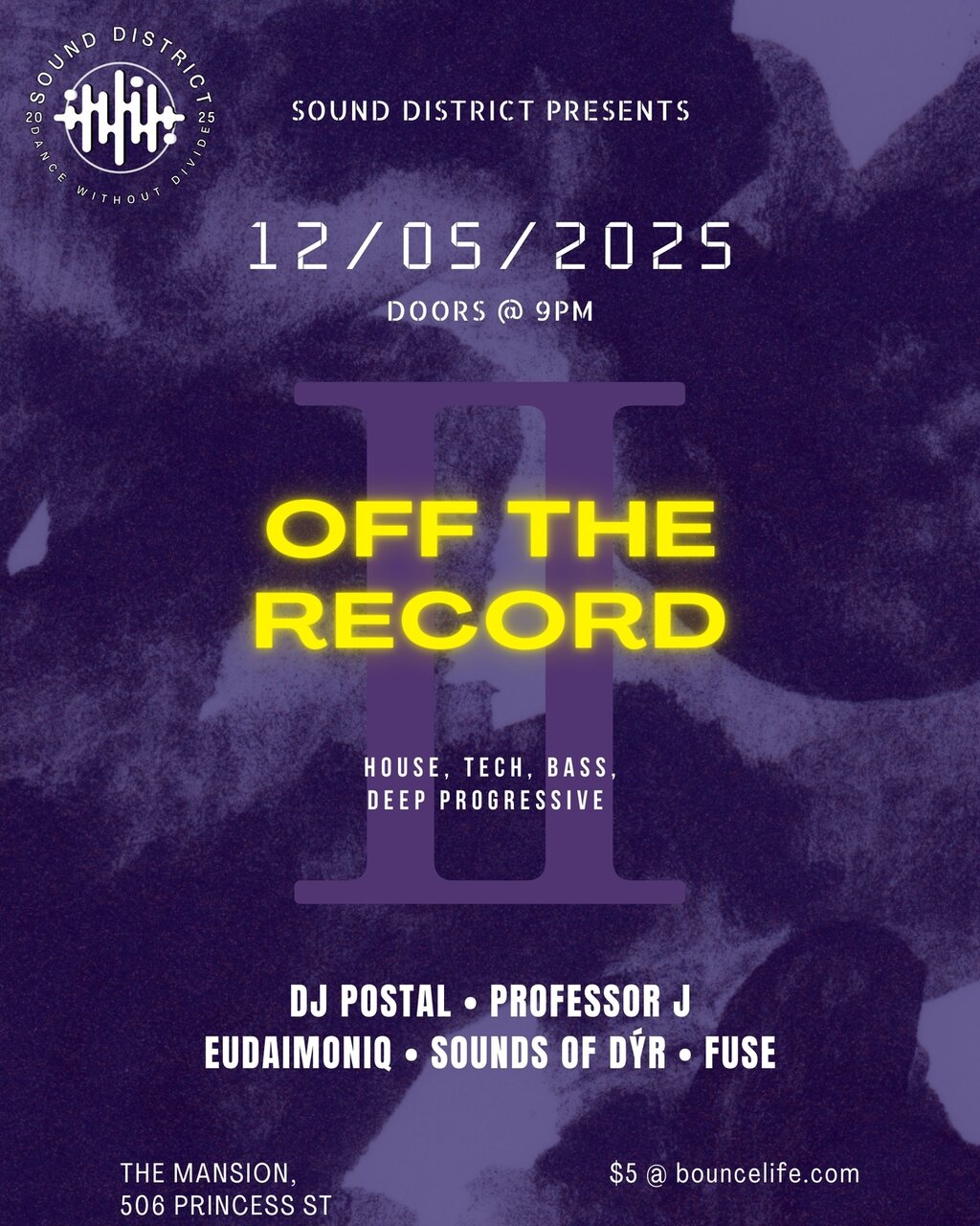 Sound District presents OFF THE RECORD II at The Mansion, diving deep into house, tech, bass and deep progressive.