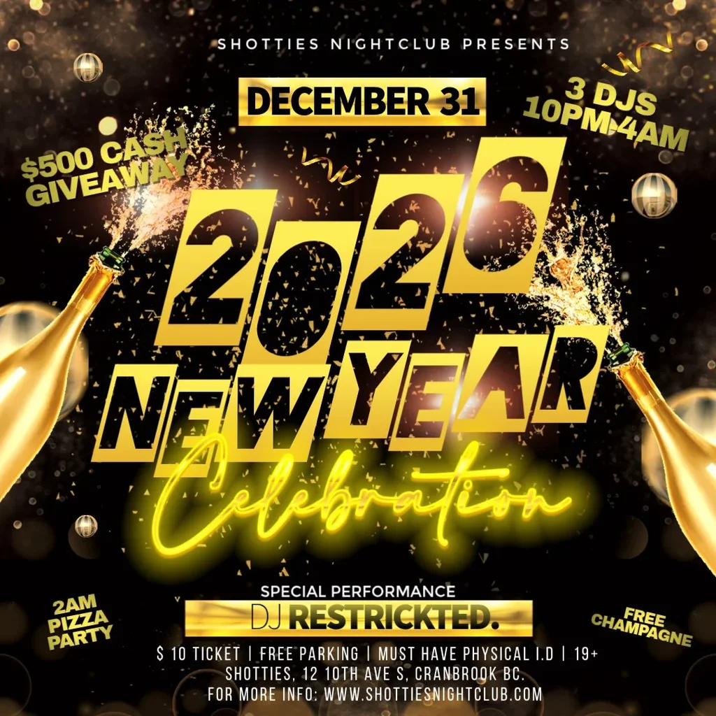 Wed. December 31st 2025 Shotties Nightclub Cranbrook BC $10