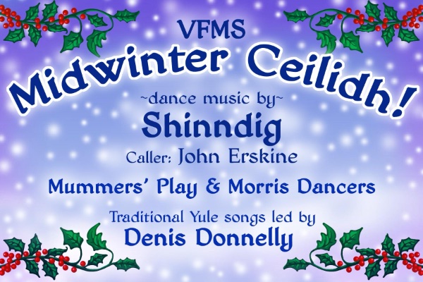 The dark of winter is upon us — what better way to lift our spirits than a Ceilidh? Bring your voices, dancing shoes, some potluck finger-food (savoury or sweet), and all your good cheer to the Folk’s annual year-end party! Doors open at 6:30 pm with the club providing the beverages (tea, coffee, mulled cider) for all. Bring your seasonally themed songs and tunes for the jam and singing circle from 6:45–7:30 — and then the show gets rolling! Denis Donnelly and others will lead us in traditional winter carols, the Morris Dancers return with the Mummer’s Play and Morris dancing, Virgo Rising will give us a few songs, and Shinndig’s new lineup (Ian Johnston, Dick Pollard, Karen Gillmore, Francis Tally & Dorothy Bright) will provide lively dance music for all, with instruction by caller John Erskine so everyone who wishes can participate!