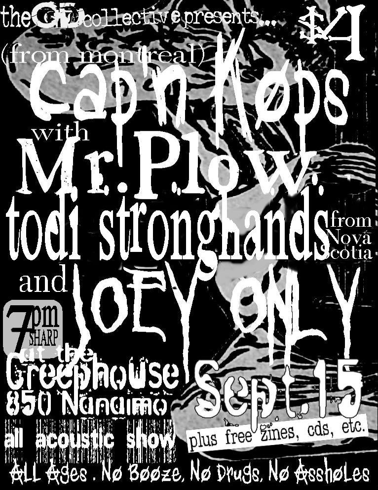 Cap'N Kops, Todi Stronghands, Mr. Plow, Joey Only, with free zines, CDs, food, a...