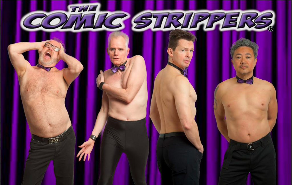 A fictitious male stripper troupe (played by a cast of some of Canada’s best improvisational comedians) performs a sexylarious improv comedy show. They try to be sexy… it just comes out funny. Constantly grooving and gyrating in between scenes they banter with the crowd and perform their hilarious twist on improv sketches. They sing, they “dance”, and they are ready to make you laugh. Semi undressed and completely unscripted, The Comic Strippers take off their shirts and take on your suggestions to create a whole new genre of comedy.