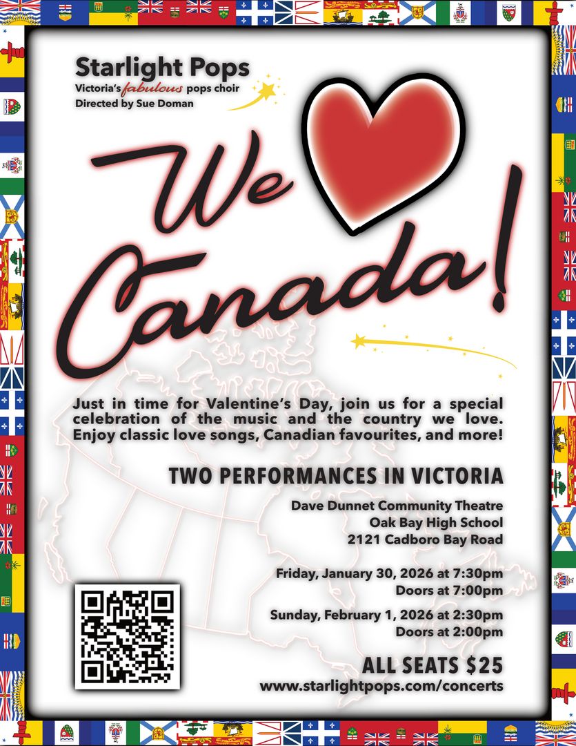 Join Starlight Pops - Victoria's fabulous pops choir - as we send an early Valentine to our beloved Canada with tunes by Joni Mitchell, Blue Rodeo, Gordon Lightfoot, Leonard Cohen, Ian Tyson, Susan Aglukark, David Foster, Stompin' Tom Connors and more! You'll also hear classic love songs that will lift your spirits and give you a warm happy feeling in these troubled times. This is full-on a celebration of the music and the country we love, and we encourage our audiences to show their patriotism by wearing red and white to this very special event. TWO PERFORMANCES: Friday, January 30 at 7:30pm and Sunday, February 1 at 2:30pm; doors open 30 minutes prior to each performance. All seats $25; advance tickets at https://starlightpops.com/concerts/