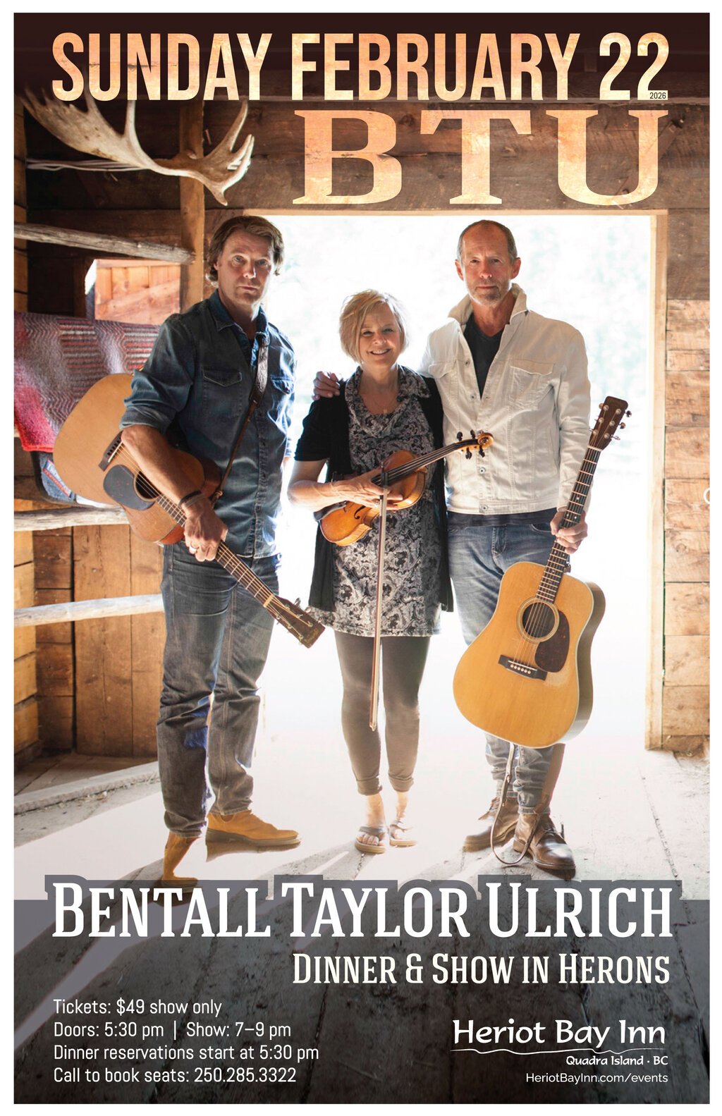 Get ready for an unforgettable evening with BTU (Bentall, Taylor, Ulrich) at the Heriot Bay Inn on Sunday, February 22! This acclaimed trio — made up of legendary Canadian singer-songwriters Barney Bentall, Tom Taylor, and Shari Ulrich — blends rich acoustic guitar, mandolin, fiddle, and swoon-worthy three-part harmonies into a captivating folk-roots sound that’s both intimate and powerful. BTU first joined forces in 2007 and has since recorded celebrated albums like Live at Cates Hill and Tightrope Walk, delighting audiences with their chemistry and storytelling.
