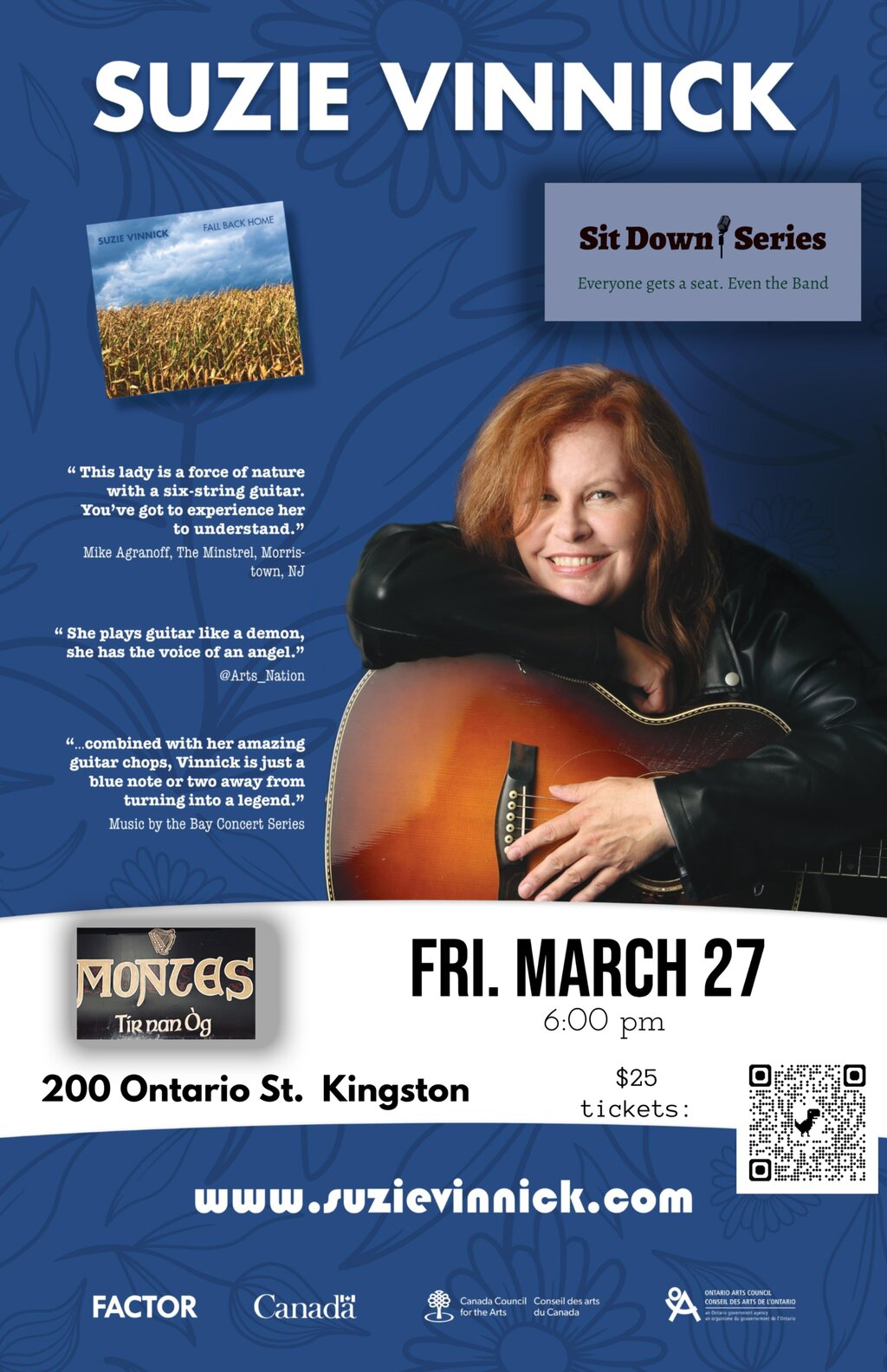 A Saskatoon native transplanted to the Niagara Region of Ontario, Canada, Suzie Vinnick is the proud owner of a gorgeous voice, impressive guitar and bass chops and an engagingly candid performance style. Suzie is a 3X Juno Nominee and has won 12 Maple Blues Awards, 2 Canadian Folk Music Awards and a 2024 ECMA with her project A’Court, Spiegel and Vinnick. She has also twice won the International Songwriting Competition – Blues Category. Her latest album is entitled “Fall Back Home”.