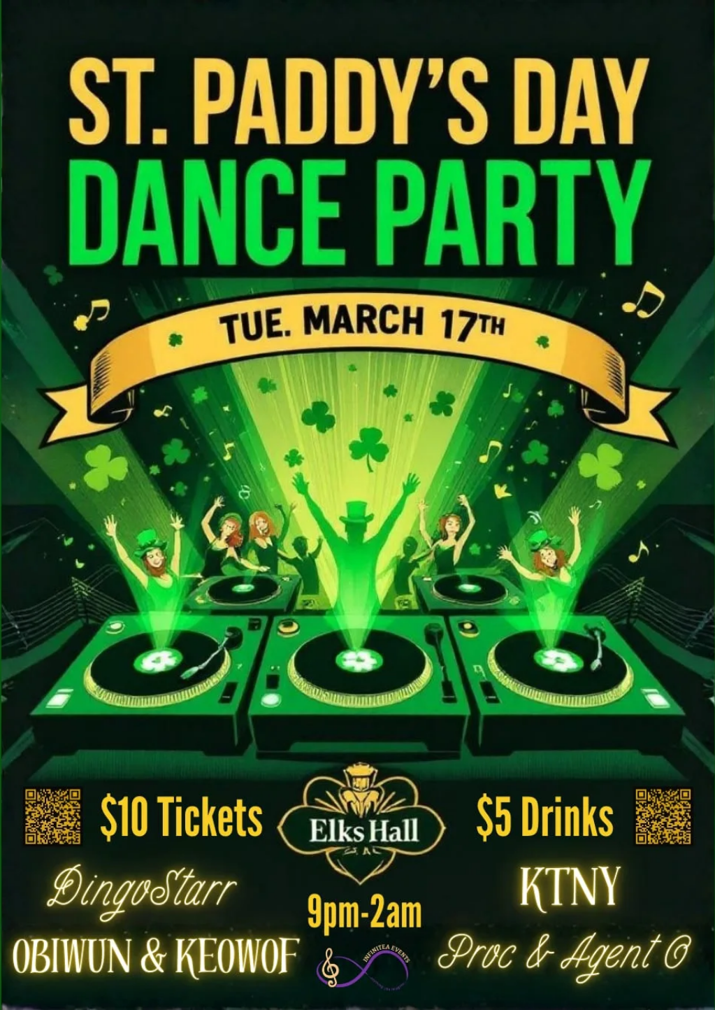 Dingo Starr, KTNY, Kobe & Kiara and Proc & Agent O will be bringing the Irish inspired beats all night so get ya green dancing shoes on!!