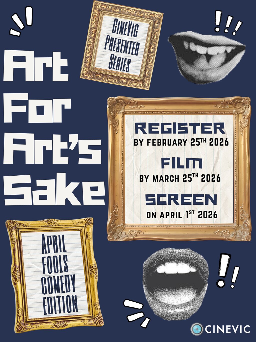 For information on signing up to make a film visit https://cinevic.ca/event/presenter-series-art-for-arts-sake-april-fools-comedy-edition-deadline-2026-02-25/