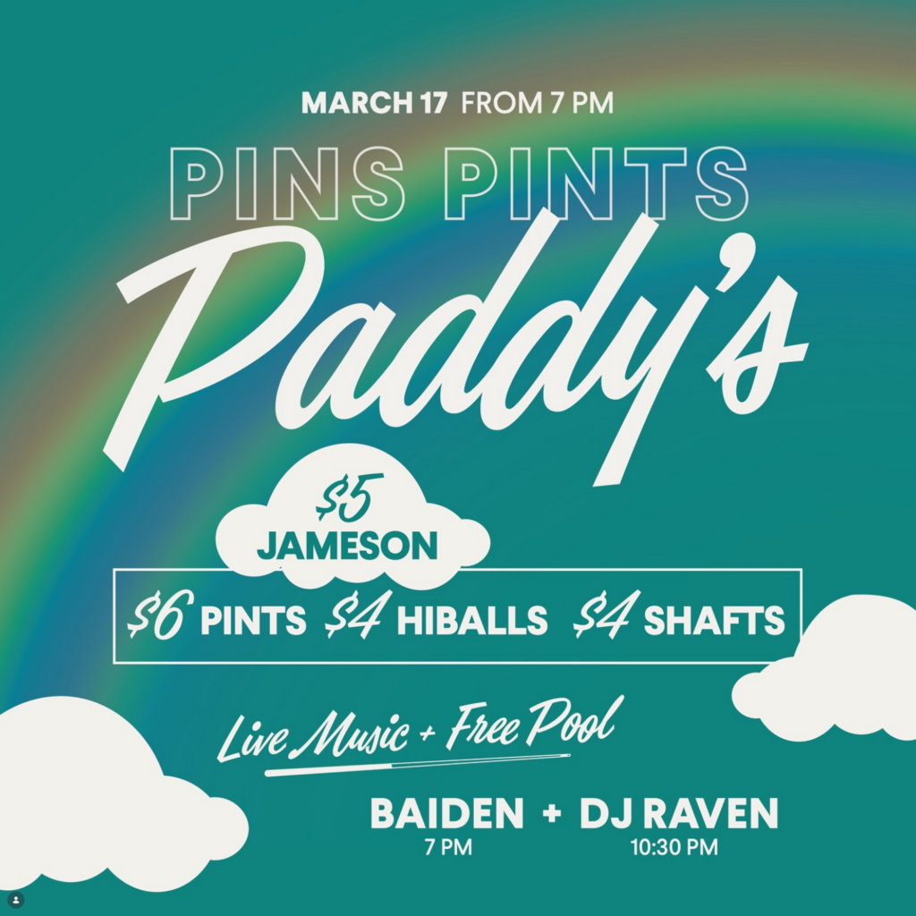 Pins, Pints, PADDY’S! 🇮🇪 Celebrate from 7pm on March 17th with drink specials, live music, and free pool!