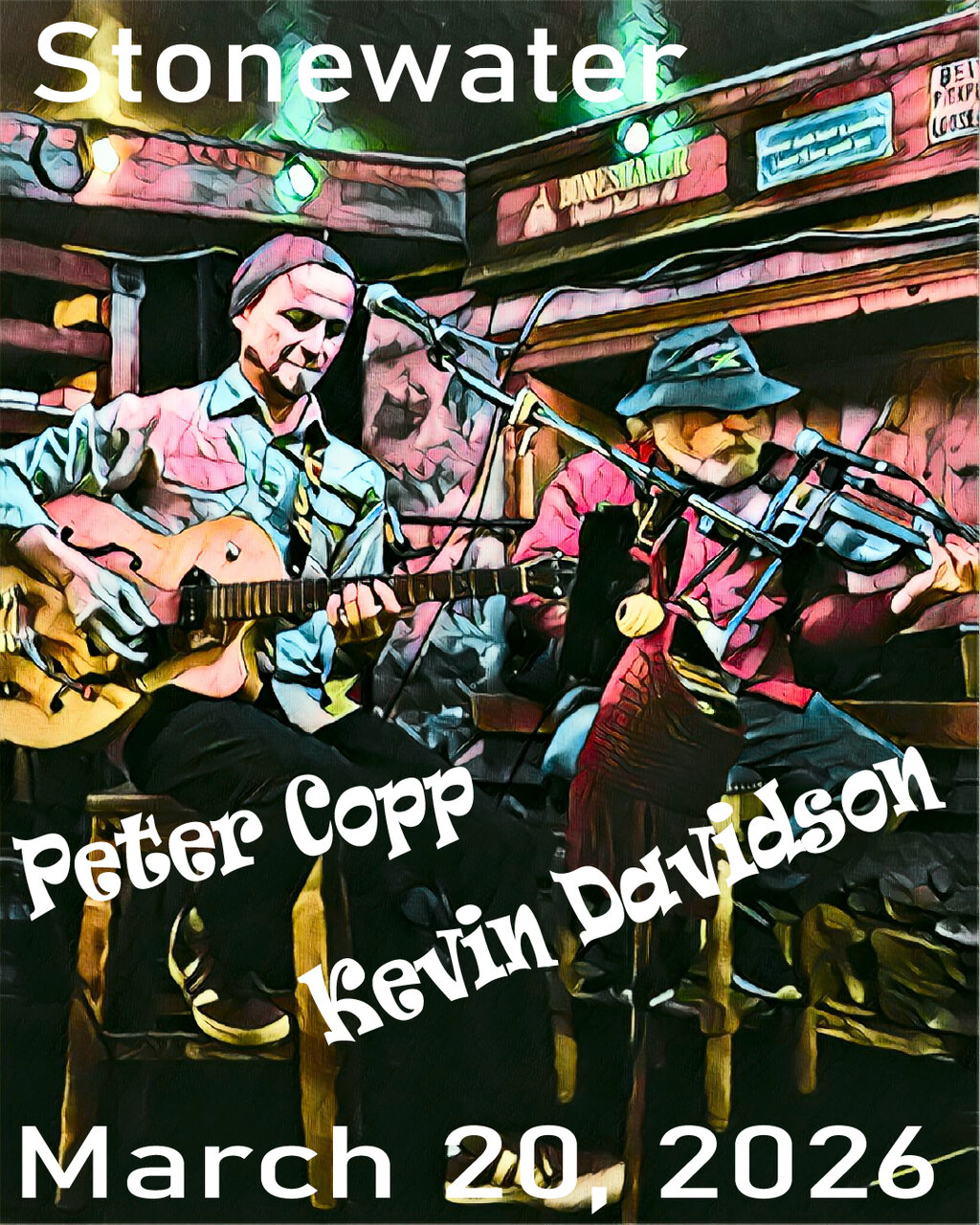 Smooth Groove Evening! Friday, March 20, 2026 - Kevin Davidson and Peter Copp will creatively mash musical mayhem with fiddle and guitar at the fantabulous Stonewater in Gananoque. Stupendous stomping permitted. Starts at 8pm