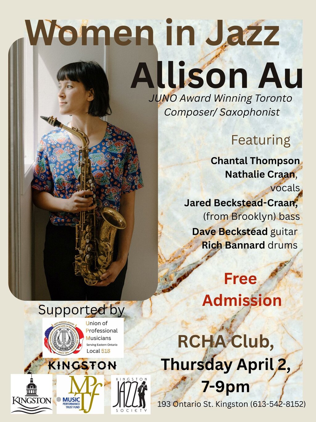 We’re thrilled to kick things off on Thursday, April 2nd from 7 to 9pm at the RCHA with a very special evening focused on women in jazz. Headlining the night is Alison Au, a JUNO Award–winning saxophonist based in Toronto whose original compositions are both lyrical and boldly contemporary. Joining her is international double bass competition winner Jared Beckstead-Craan, alongside some of Kingston’s finest musicians.