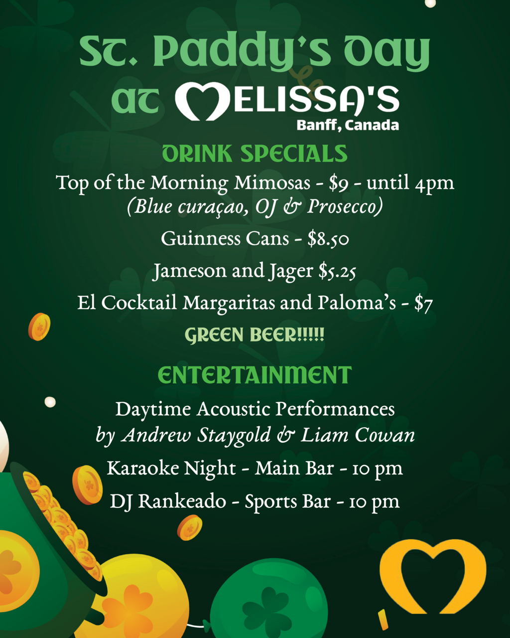 This year at Mel's we go hard for St. Paddy's ALL DAY LONG! Our in-house acoustic artists Andrew Staygold and Liam Cowan will seranade you all day long, then at night the main stage turns over to Karaoke Night with Andrew hosting and DJ Rankeado will blast dance tunes in the sports bar all night!