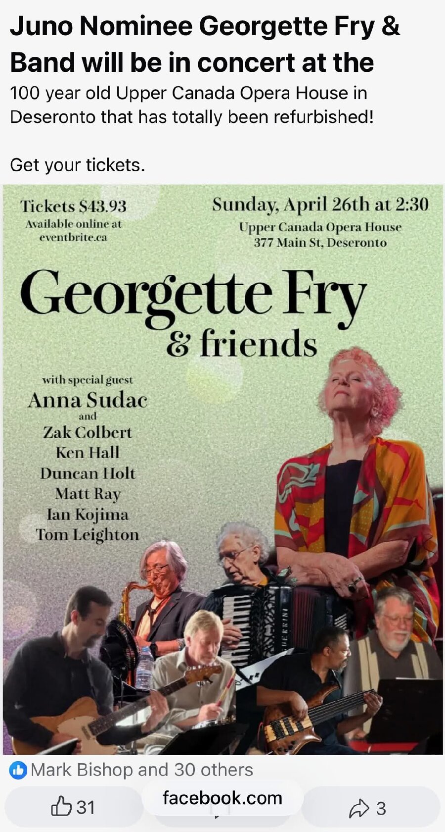 Juno nominated and multi award winning Blues artist Georgette Fry is performing a Sunday Matinee April 26th at The Upper Canada Opera House
