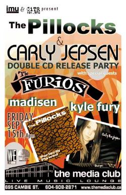 TONIGHT! Friday, Sept 15th IMU & CiTR present The Pillocks & Carly Jepsen Double CD Release Party with special guests The Furios, Madisen + Kyle Fury @ The MEDIA CLUB, 695 Cambie . 8pm / $10