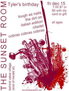 Tyler's 19th birthday! post-rock, hardcore, progressive grind, indie rock mixed genre radness: Tough As Nails, Italian Edition, Citadel, Cobras Cobras Cobras, one more tba!, Santa with random presents