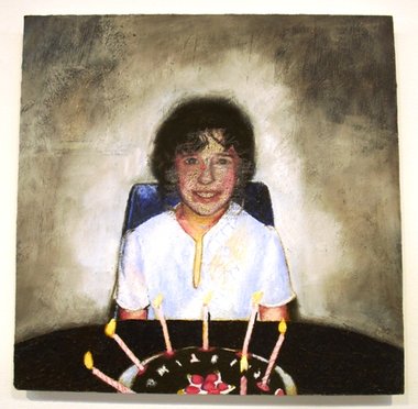 The birthday party has been around, as a cultural institution for some time. Photography as a means to document celebrations, substantial events and commonplace circumstances seemed to supplant paintings in the 20th century. By mid 20th century North America everybody seemed to celebrate, at least a child’s birthday, with cake and candles, taking snaps to mark the occasion. Clark’s work is a document to her memories of her familial celebrations recorded through family photographs, painted to accentuate and respond, counter the photographed images, marking the occasions with her bringing forward her understanding and feelings that are unique to painting, visions of time and place through her observations and experiences.