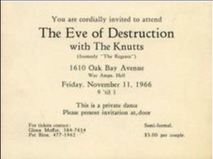 By 1963, Larry and Mike had moved on to other bands. Rick Johnston answered an ad for a drummer and joined us. We were hearing more and more about an English group called the Beatles that was big in Europe and coming to North America. This is when we first met Raymond Peter May. He had an English accent, had longer hair and wore Beatle boots……….and he could sing. We started trying vocals. . This was also a time of protest and folk songs. We were asked to back up the singers for a hootenanny at St Ann’s Auditorium. At the end of the show, after several hours of folk music, we were introduced as “….and now we bring you the Beatles”. The reaction from the crowd was like what we’d seen on the Ed Sullivan Show. We played Kansas City and Twist & Shout but could barely hear ourselves because of the screaming. We started switching to vocals right away. Ray was really into Little Richard, the Animals & The Beatles. He was also a natural showman/character. He had us doing steps. Vince turned out to be a very good singer as well. Steve Pugsley had joined us on bass guitar by this time and Brian had moved on. Within a short time all our songs were vocals except our break songs. .
