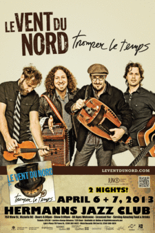 Having given the La Part du Feu concert 250 times in North America, Europe, South America, and Scandinavia, Le Vent du Nord presents a new show with the songs of Tromper le temps (Fooling Time), its 7th album (released in Spring 2012). Made up of 4 singers and multi-instrumentalists, Le Vent du Nord returns to its roots, drawing from yesterday and today to give us a glimpse the hopes of possible tomorrows. Through songs meant to resist the march of time, the Tromper le temps concert evokes often forgotten episodes of Québec’s history with provocative texts and poetic descriptions destined to endure throughout the ages. A way to fool time…while there is still time! It is a concert that stirs emotions and touches the heart and soul.