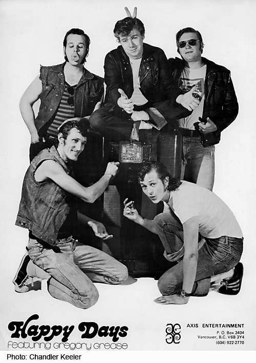 That’s me Gregory Grease aka Robin May in the middle, Gord Jarnell top left, Steve Kohut top right, Tony Manning bottom left and Bob Van Velzan bottom right. The name Gregory Grease was bestowed upon me by Tom Lucas , DJ at CFUN Radio at the time and Barry Samuels named us HAPPY DAYS.