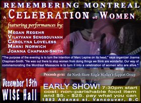 I’m writing to invite you to attend Remembering Montreal: A Celebration of Women, an evening of ceremony and performance in response to the negative intentions of Marc Lepine. The event, which will take place on December 13 at 7:30 p.m. at the W.I.S.E. Hall (1882 Adanac St.), will be a holiday fundraiser for the North Shore Single Mothers’ Support Group (sliding scale $5-$25).