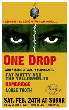 SO BE SURE TO COME OUT AND CELEBRATE ONE DROP'S SAFE (ISH) RETURN FROM AMERICA – SATURDAY, FEBRUARY 24TH AT SUGAR NIGHTCLUB. ONE DROP WILL BE JOINED BY VANCITY PUNKS CAMBRIDGE, FATY MATY AND THE YELLOWBELTS & LOOSE TOOTH!