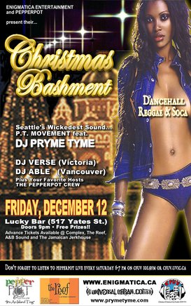 ENIGMATICA ENTERTAINMENT & PEPPERPOT are proud to present the Caribbean party of the year when we host our CHRISTMAS BASHMENT, Friday, December 12, 2003 @ Lucky Bar on Yates Street. The Bashment (meaning "all out" Caribbean party) will feature Seattle�s wickedest dancehall selector � PT MOVEMENT�S DJ PRYME TYME along with our own DJ Verse from Victoria and Vancouver�s DJ Abel.