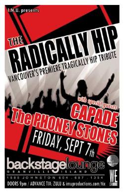 . Friday, September 7th I.M.U. presents The RADICALLY HIP w/ CAPADE & The PHONY STONES @ The Backstage Lounge on Granville Island (1585 Johnston St.) . 9pm / $10 - Purchase advance tickets online at http://www.imuproductions.com/tix