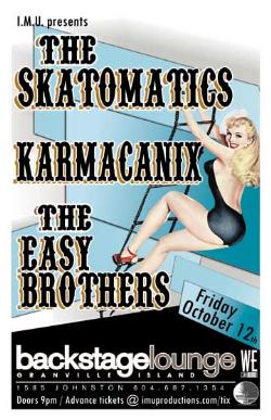 . Friday, October 12th I.M.U. presents The SKATOMATICS, KARMACANIX & EASY BROTHERS @ The Backstage Lounge on Granville Island (1585 Johnston St.) . 9pm - Purchase advance tickets @ http://www.imuproductions.com/tix