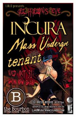 . Wednesday, October 31st I.M.U. presents ALL HALLOW'S EVE w/ INCURA, MASS UNDERGOE & TENANT @ The Bourbon, 50 West Cordova . Doors 7pm . $10 Advance . Purchase advance tickets online at http://www.imuproductions.com/tix . $12 at the door