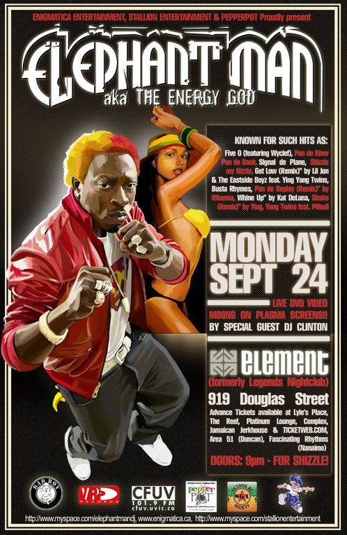 ELEPHANT MAN aka Energy God will be playing at Element (formerly Legends) on Monday, September 24th for the first time. You may have heard some of his hits such as Pon de River Pon de Bank, Signal de Plane, F**K You Sign, Shizzle my Nizzle and his most recent release "Five O" featuring Wyclef. Fans will be treated to a full night of dancehall and reggae. + They'll be live DVD Video Mixing on 10 Plasma's TV's Around the Club by special guest, DJ Clinton.