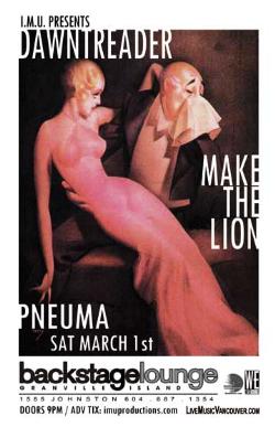 . Saturday, March 1st I.M.U. presents DAWNTREADER, MAKE THE LION & PNEUMA @ The Backstage Lounge on Granville Island (1585 Johnston St.) . 9pm / $10 Advance - Purchase advance tickets online @ imuproductions.com