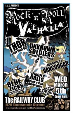 . Wednsday, March 5th I.M.U. presents ROCK'N'ROLL VALHALLA! THOR Tour Kick Off party w/ special guests The UNKNOWN SOLDIERS Doors Tribute, Mint Record's VANCOUGAR, The BLUE TICKS, JENNIFER DOLL's Rock'n'Roll Burlesque & special guest MC, JOE KEITHLY of DOA! @ The Railway Club, 579 Dunsmuir Street . Doors 8pm