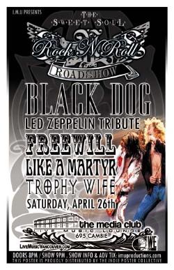 . Saturday, April 26th I.M.U. presents The ROCK'N'ROLL ROADSHOW! featuring BLACK DOG Led Zeppelin Tribute w/ FREEWILL, LIKE A MARTYR & TROPHY WIFE @ The Media Club, 695 Cambie . Doors 8pm, $10 Advance - Purchase advance tickets via the bands or online @ http://www.imuproductions.com
