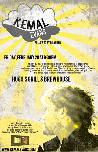 Kemal Evans is a mix of funky beats, soultry sounds and a little reggae thrown in so come down to Hugo's for a night of booty-shakin' and groovin' as Kemal and his band perform tunes from his debut album "No Pressure System". Afterwards, enjoy DJ Anger as he spins a mix of hip/hop and top 40 beats until the early morning hours.