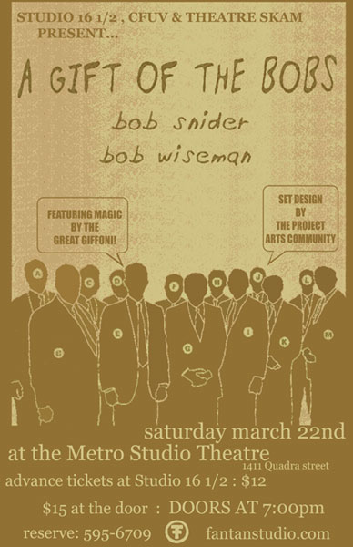 A Gift of the Bobs: Bob Snider, Bob Wiseman, Magic by Great Giffoni!, Set design by The Project Arts Community @ Metro Studio Mar 22 2008 - Feb 12th @ Metro Studio