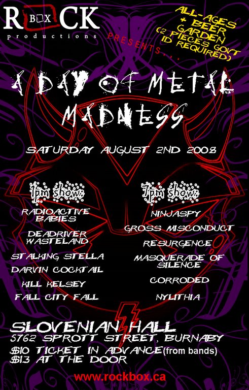 A Day of METAL MADNESS!! All-Ages w/BEER GARDEN!!: Radioactive Babies, Stalking Stella, Darvin Cocktail, Kill Kelsey, Fall City Fall, DeadriverWasteland, Ninjaspy, Gross Misconduct, CORRODED, Masquerade Of Silence, Nylithia