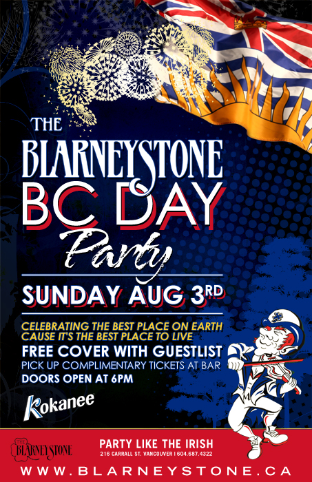 Monday is BC DAY and we are bringing it in with a BANG! Join us for the best party in the city. We are warming it up with live muic with Killarney and DJ "D-Rock" spinning the tunes all night long. Cover charge is FREE with a guestlist. Sign up for your guestlist under the reservations section at www.blarneystone.ca. You don't want to miss this one!