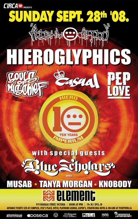 Welcome to hip hop heaven everyone! Sunday, September 28th Victoria is proud to present some of the pioneers of the hip hop world new and old school when the HIEROGLYPHICS roll through Victoria on their 10th Anniversary Tour alongside the Northwest's best BLUE SCHOLARS. Hiero crew will feature Souls of Mischef, Casual, Pep Love, Knobody, Musab & Tanya Morgan. Tickets available NOW at Lyle's Place, Complex, Ditch Records, Strathcona Hotel, Platinum Lounge, Lucid (in Nanaimo) & TICKETWEB.CA!!