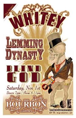 Saturday, Nov 1st I.M.U. presents WHITEY, LEMMING DYNASTY & BLIND GOD . Early Show 8-11pm @ The Bourbon, 50 West Cordova . Early show 8-11pm sharp / Purchase advance tickets online @ imuproductions.com