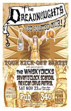 . Saturday, Nov 22nd I.M.U. presents The DREADNOUGHTS Tour Kick Off Party w/ special guests The WHISKYDICKS, SEVEN'O'CLOCK SCANDAL & MEXICAN DRUG PATROL @ Pub 340, 340 Cambie Street . Doors 8pm / Purchase advance tickets online @ www.imuproductions.com
