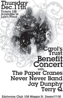 We lost our dear Carol in a tragic accident on September 5th 2008. She has left behind her husband Pitr and 3 year old twin girls. In her memory and to raise money for her little girls I am throwing a benefit concert. All monies raises will be put in a trust fund for her little girls called Carol's Trust, which is being regulated by a lawyer.