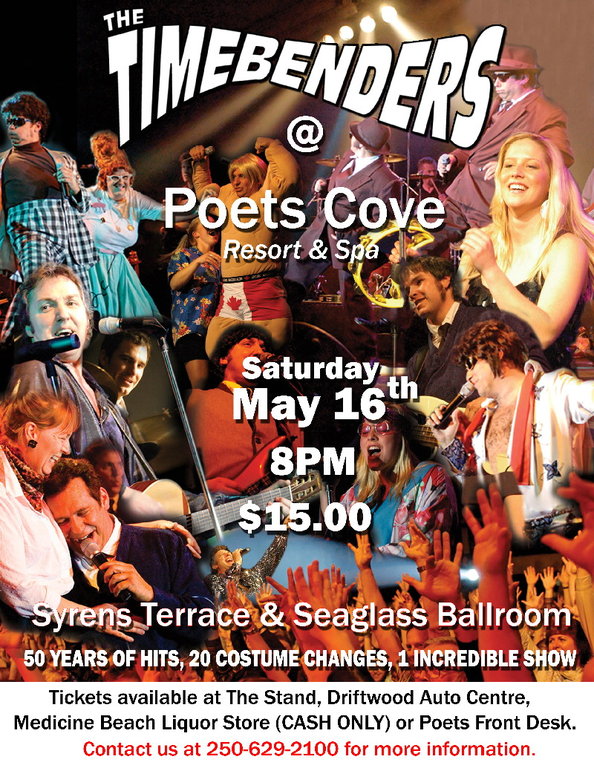 The Timebenders will be at Poets Cove to help celebrate Poets 5th Anniversary, on May 16th. Tickets are $15.00. Good room rates also available. Call 250-629-2100.